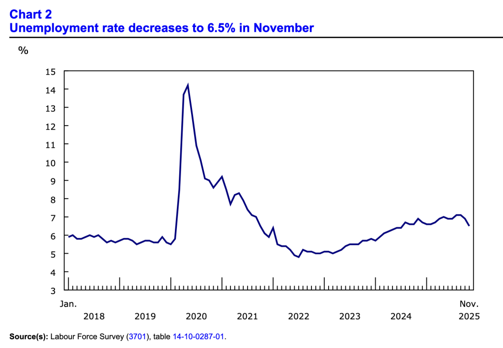 “The unemployment rate fell 0.4 percentage points to 6.5% in November, following a 0.2 percentage point decline in October. The unemployment rate had previously trended up through most of 2025, reaching 7.1% in September—the highest level since May 2016 (excluding 2020 and 2021 during the COVID-19 pandemic).”