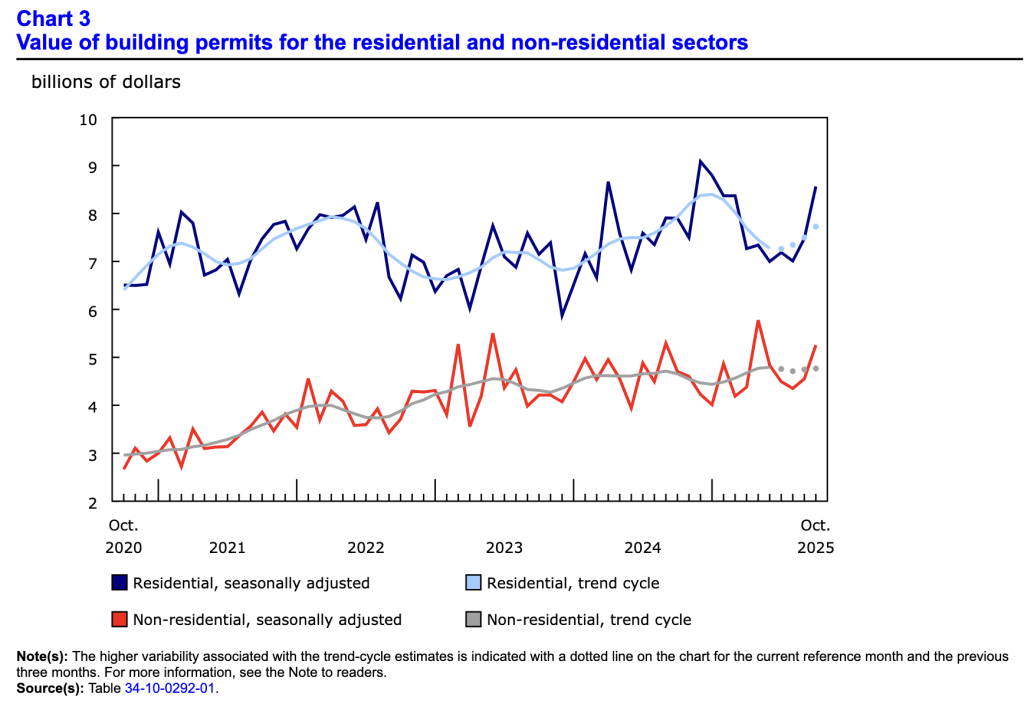 “In October, the total value of building permits issued in Canada rose $1.8 billion (+14.9%) to $13.8 billion. The increase in construction intentions was led by the residential sector (+$1.1 billion). An increase was also observed in the non-residential sector (+$702.8 million)….