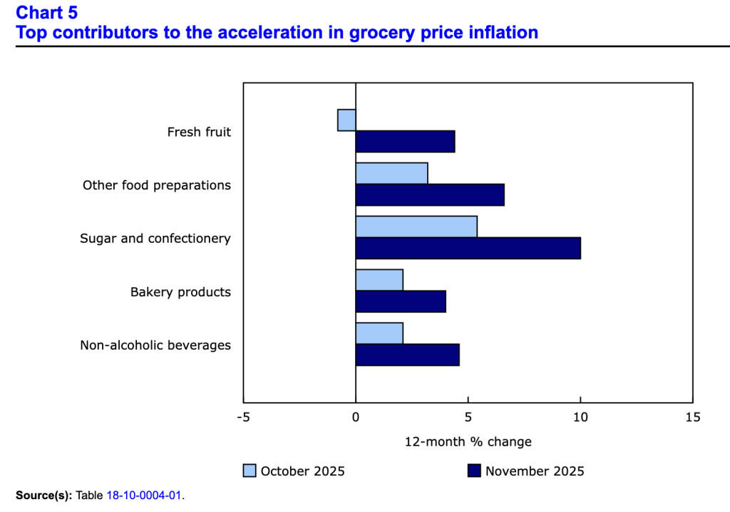 Food inflation rose by 4.7% Y-o-Y in November, a noticeable increase from the 3.4% jump in October. This month’s rise was the largest since December 2023, and the primary drivers were fresh fruit (+4.4%), led by higher prices for berries, and other food preparations (+6.6%).