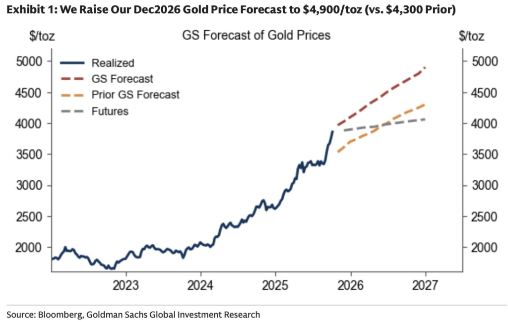 “We look for additional price upside by the end of 2026, with our forecast at $4,900 per troy ounce. Not as fast as this year – we were up almost 60% year-to-date – but the two drivers of the ‘25 rally, we think, will be repeated in ‘26…. We see our upgraded gold price forecast as still skewed to the upside on net, because private sector diversification into the relatively small gold market may boost ETF holdings above our rates-implied estimate.”