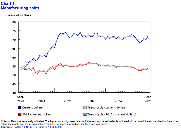 “Manufacturing sales reached their highest level since February 2025, rising 3.3% month over month to $72.1 billion in September. Sales rose in 14 of the 21 subsectors, led by the transportation equipment (+9.2%) and petroleum and coal (+5.3%) subsectors….