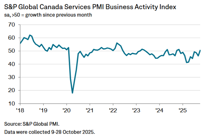 “Canada’s service sector expanded in October for the first time in 2025…. The Business Activity Index moved above the critical 50.0 no-change mark for the first time since November 2024. At 50.5, the index was notably higher than September’s 46.3 and well above readings seen during the spring.”