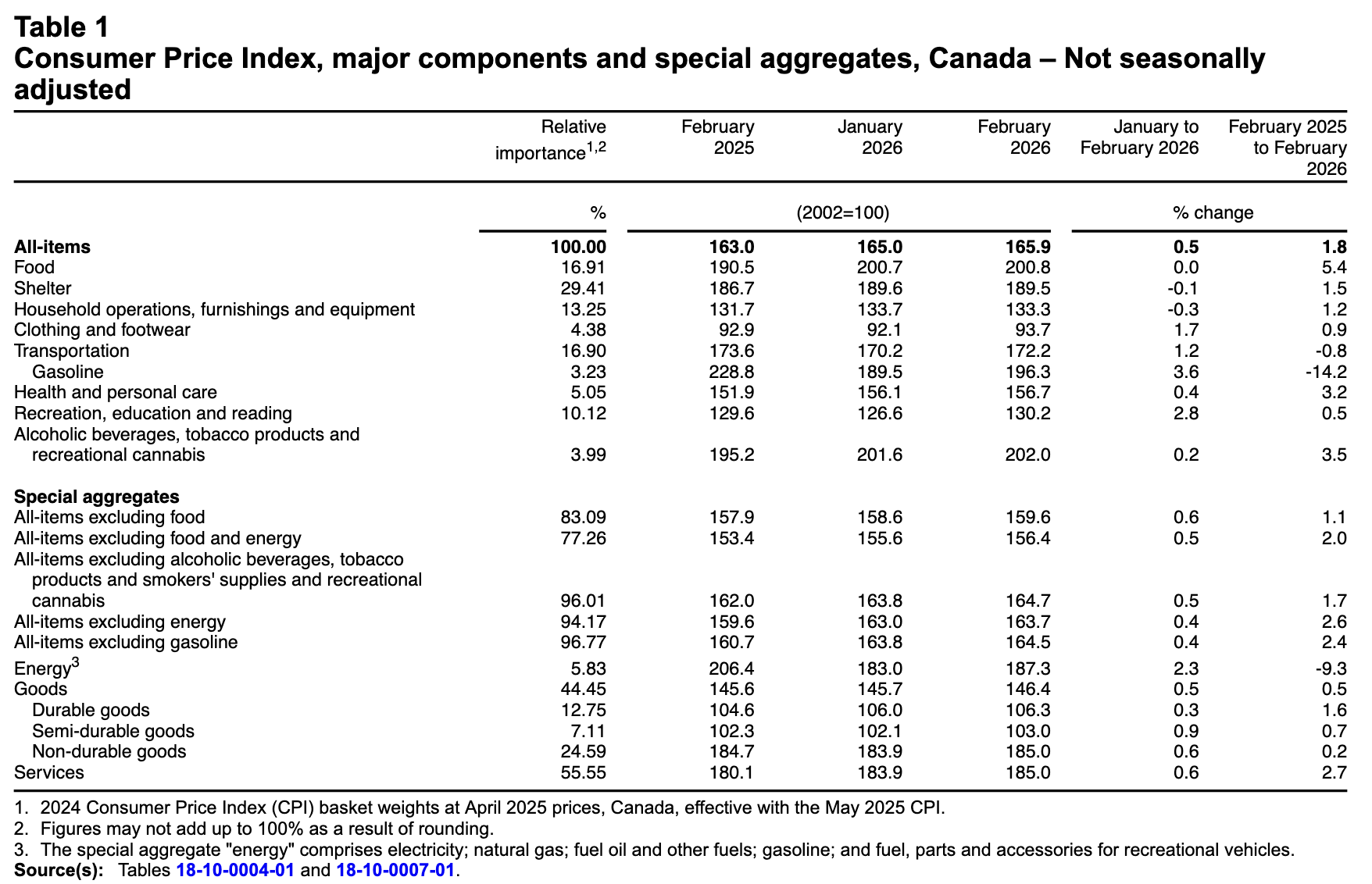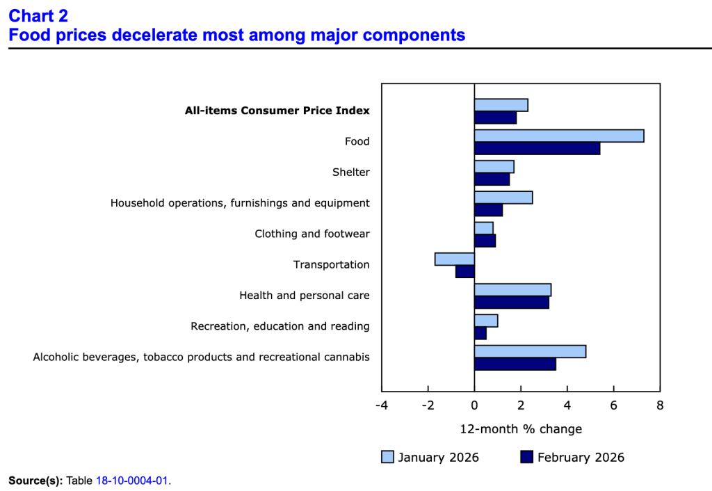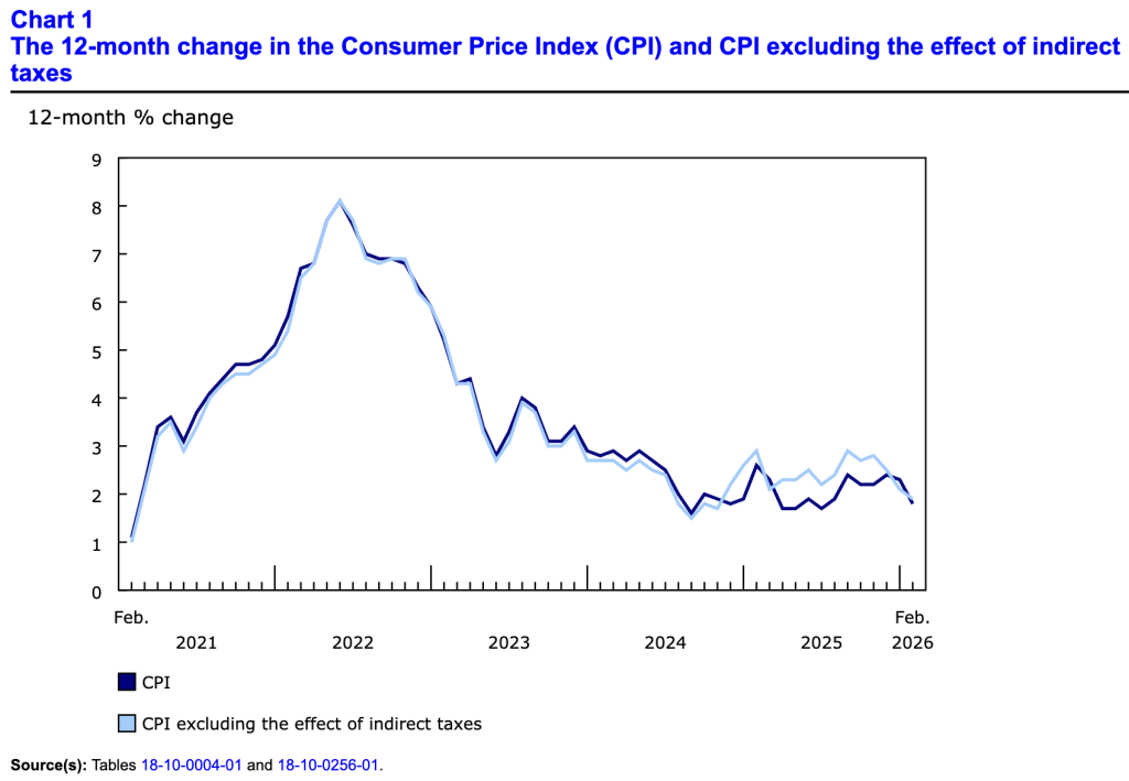 Canada’s consumer price index (CPI) increased by 1.8% year over year (Y-o-Y) in February, down from 2.3% Y-o-Y in January. Statistics Canada (StatsCan) published the data at 8:30 a.m. ET on March 16, 2026, via The Daily report. On a monthly basis, the CPI rose by 0.5%, and base effects from last year’s GST/HST holiday provided some distortions that helped slow the Y-o-Y figure.