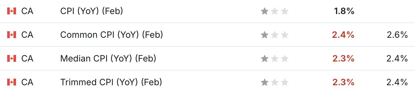 Core measures of the CPI all slowed in February, with the CPI-common index falling to +2.4% (from +2.7%), the CPI-median falling to +2.3% (from +2.5%), and the CPI-trim falling to +2.3% (from +2.4%). These measures exclude the impacts of food and energy, and the BoC places heavy emphasis on core measures because they provide a smoothed distribution of overall inflation.