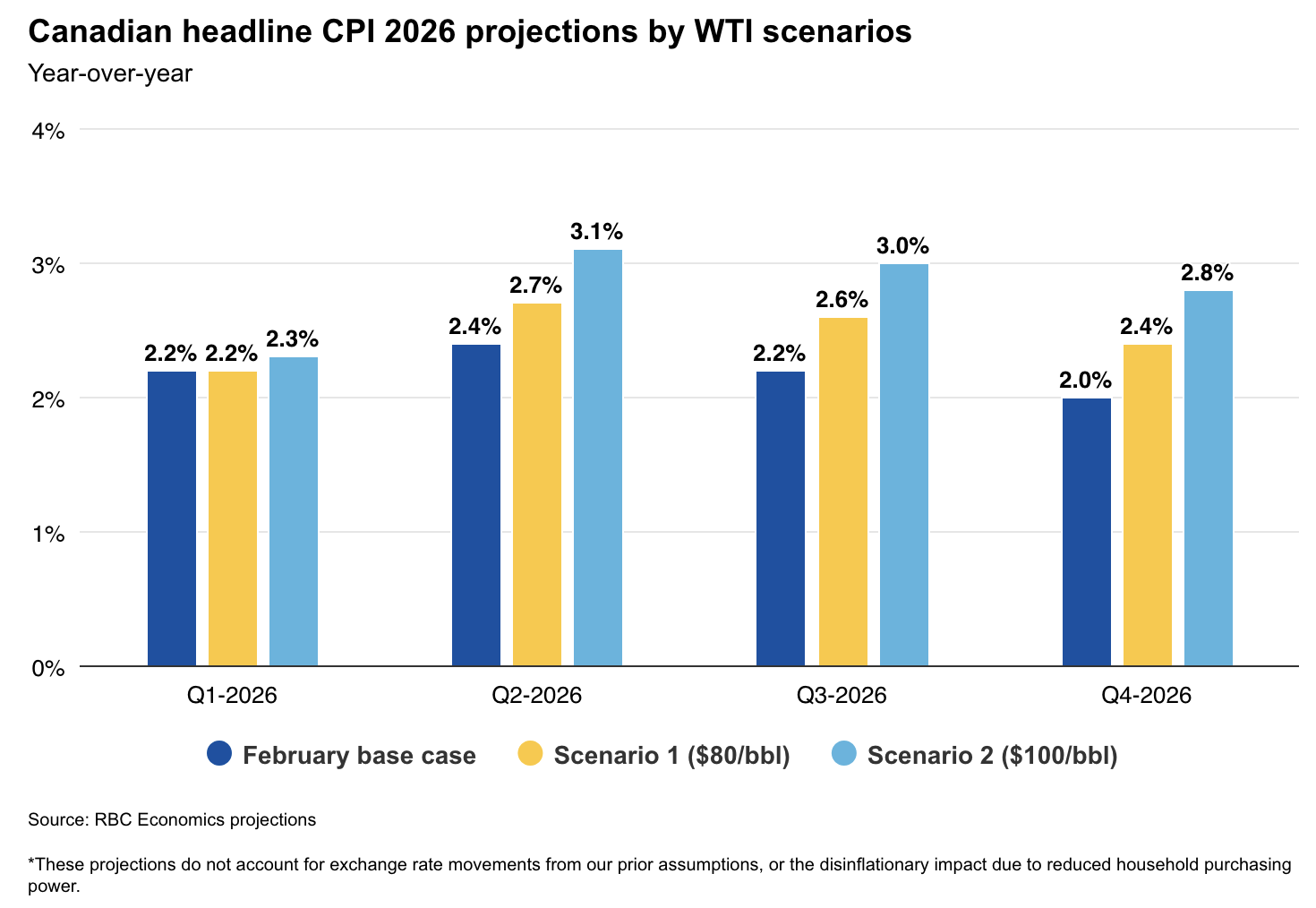 To explain, the bank’s base case is a short-term conflict where oil prices normalize and have a minimal impact on the headline CPI (the dark blue bars). However, under scenarios of $80 and $100 WTI (the yellow and light blue bars), the headline CPI peaks near 3% and then resumes its descent later in 2026.