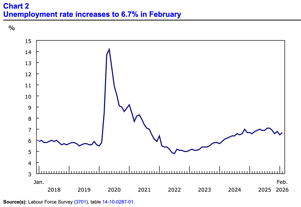 For example, Statistics Canada revealed on Mar. 13 that “Employment declined by 84,000 (-0.4%) in February, after edging down in January (-25,000; -0.1%). These cumulative declines partially offset the upward trend observed in the fall of 2025.” Moreover, “the number of people working full-time declined by 108,000 (-0.6%), offsetting growth recorded over the previous two months.”